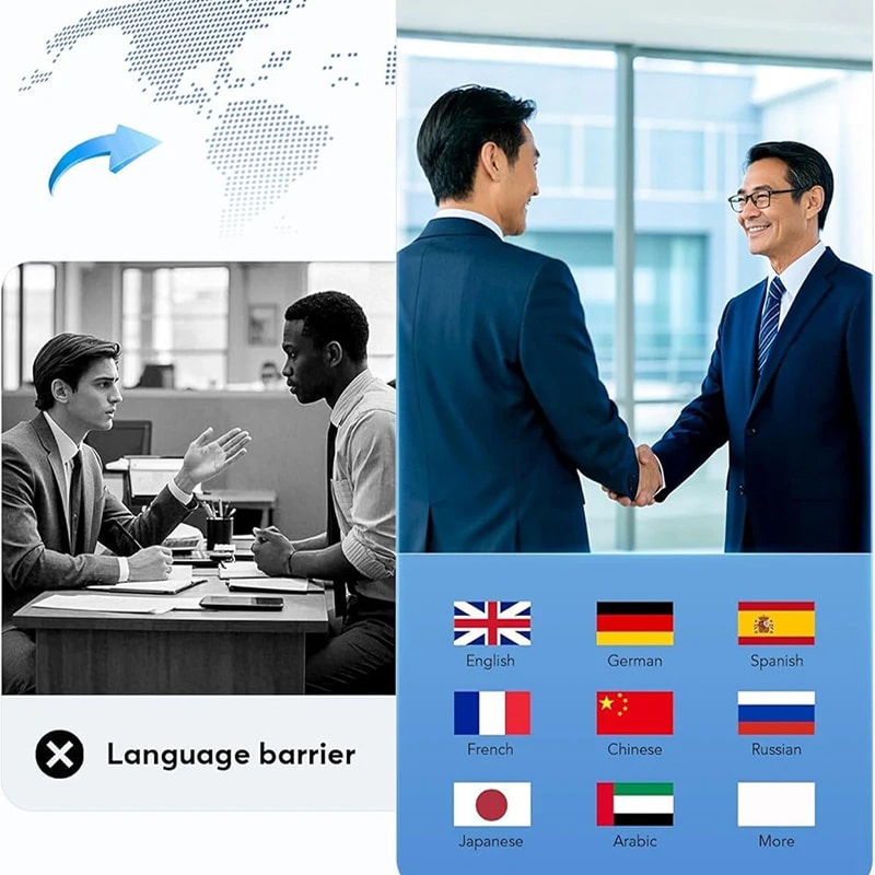 Each earbud provides 8 hours of continuous translation use. The portable charging case extends total battery life to 80 hours, ensuring reliable performance throughout extended business trips without frequent recharging.