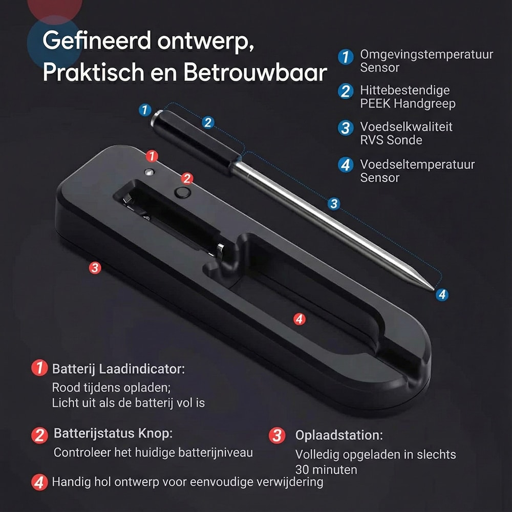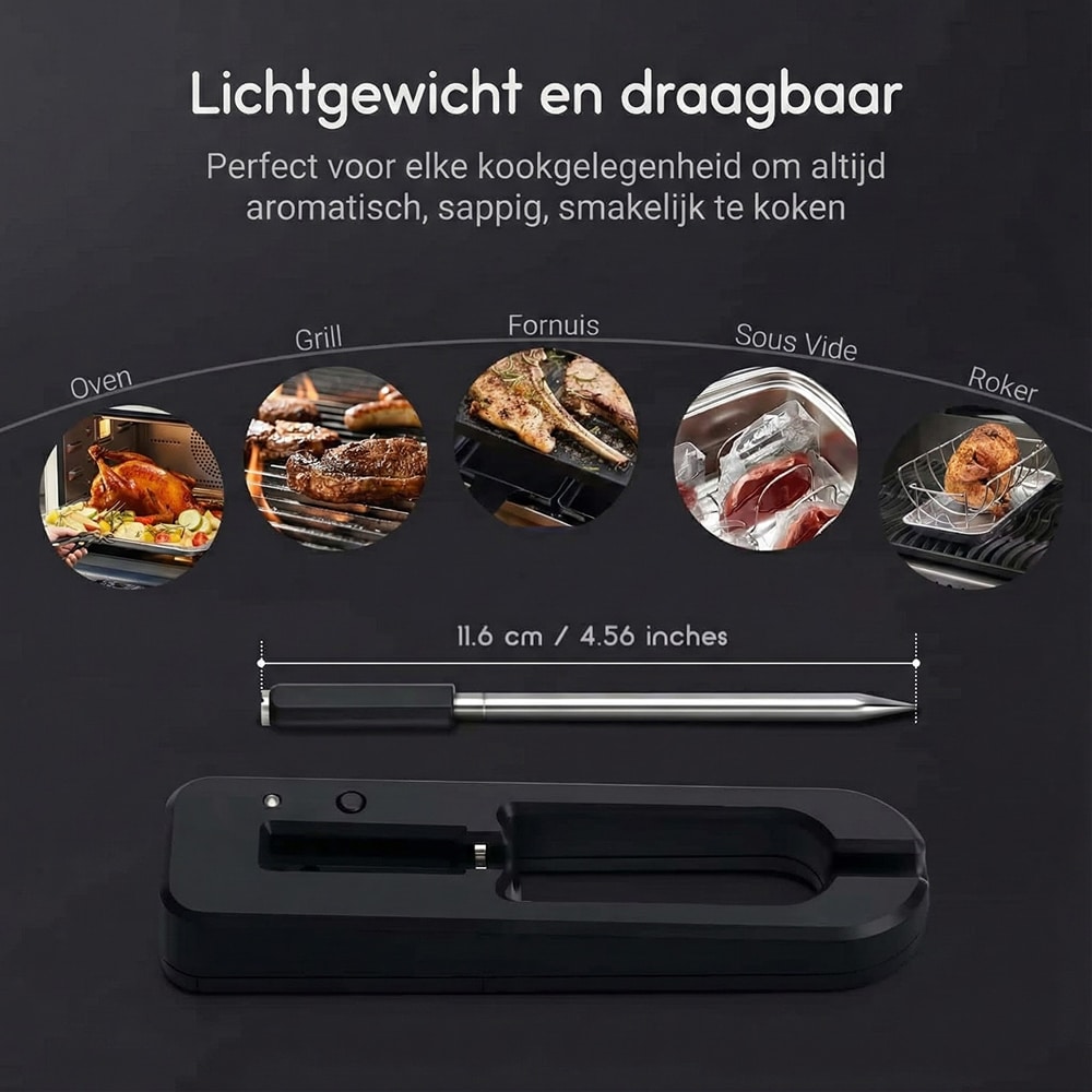 Absoluut! De sonde is hittebestendig tot 300°C en kan veilig in de oven, grill of smoker blijven tijdens het koken. Het PEEK-materiaal beschermt tegen extreme hitte zonder te beschadigen.