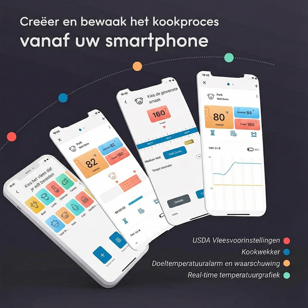 De TempaKoo helpt dit voorkomen met voorwaarschuwingen die u waarschuwen voordat uw voedsel de doeltemperatuur bereikt. U kunt ook aangepaste alarmen instellen om overcooking te minimaliseren en perfecte resultaten te garanderen.
