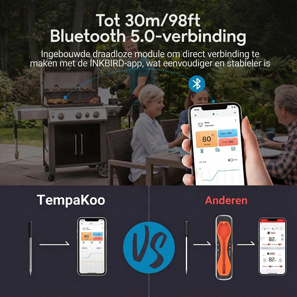 De TempaKoo biedt betrouwbare Bluetooth-connectiviteit tot 30 meter in open ruimtes. Het binnenbereik kan variëren afhankelijk van muren en obstakels, maar behoudt doorgaans sterke verbinding door de meeste huizen.