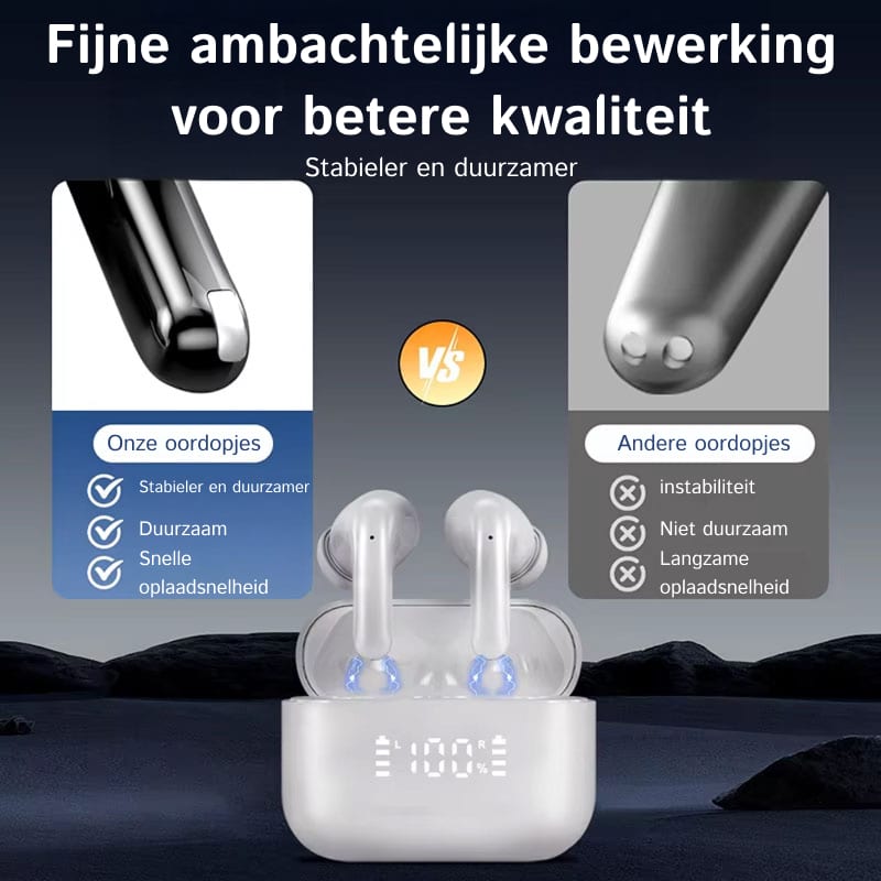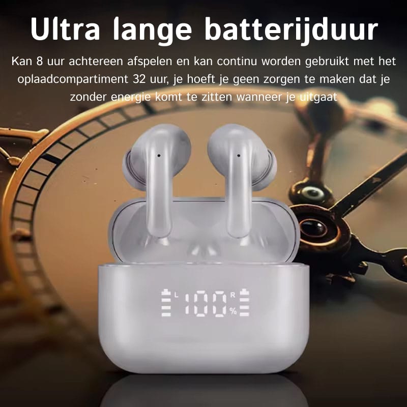 De oordopjes gaan tot 8 uur mee, en de oplaadcase biedt extra 24 uur batterijduur.