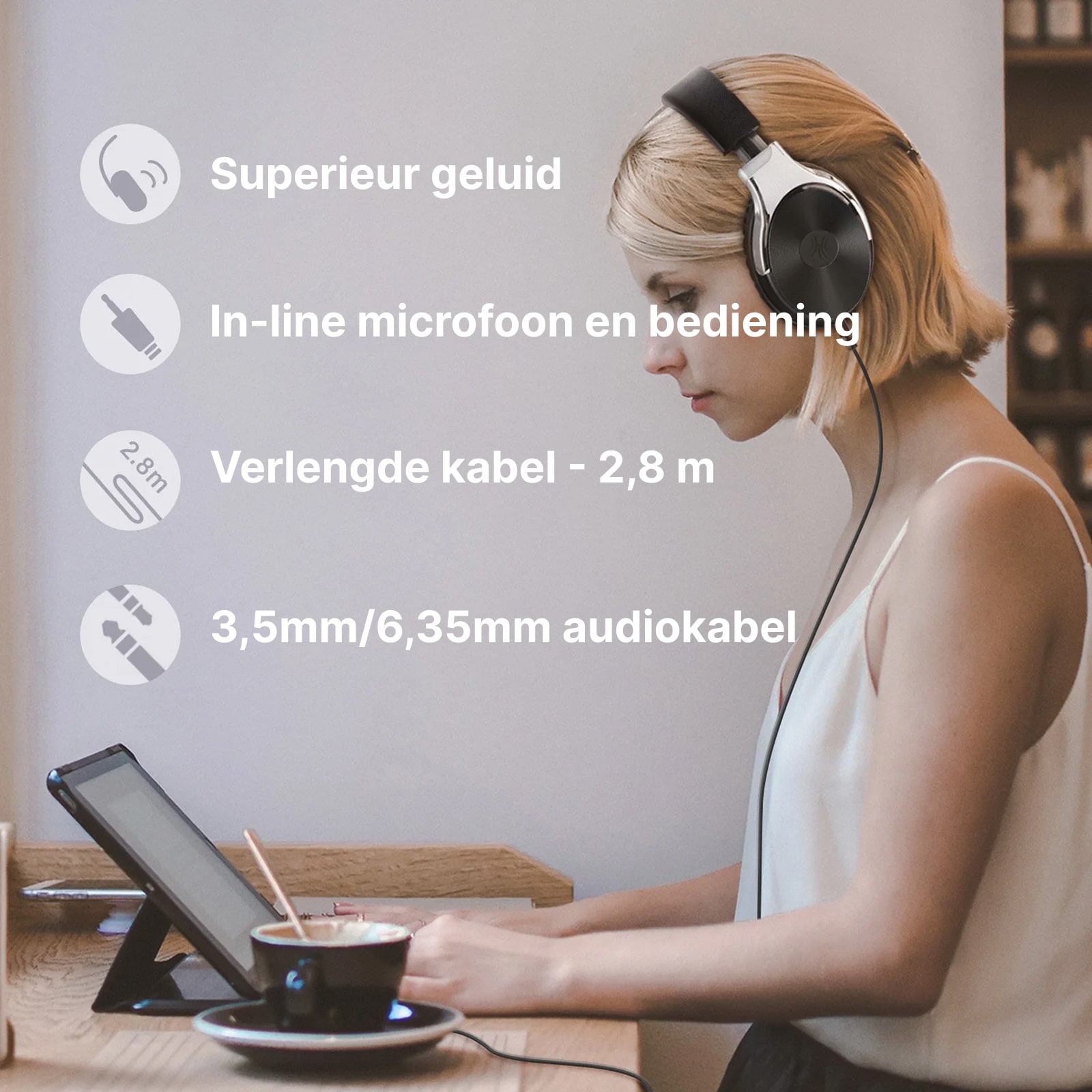 De 2.8m rechte kabel is ideaal voor studio-opstelling, terwijl de spiraalvormige kabel flexibiliteit biedt voor beweging. Beide hebben 3.5mm en 6.35mm connectoren voor universele compatibiliteit.