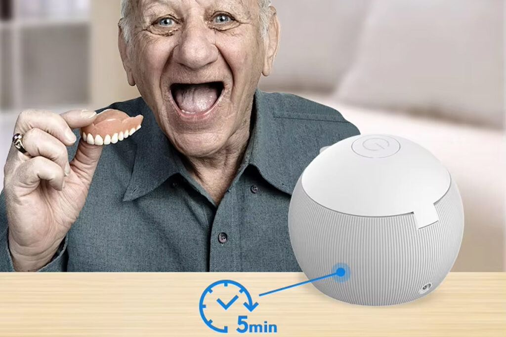 The spacious chamber accommodates most retainers, aligners, mouthguards, and dentures comfortably. It measures large enough for full denture sets while remaining compact enough for bathroom counters without taking excessive space.