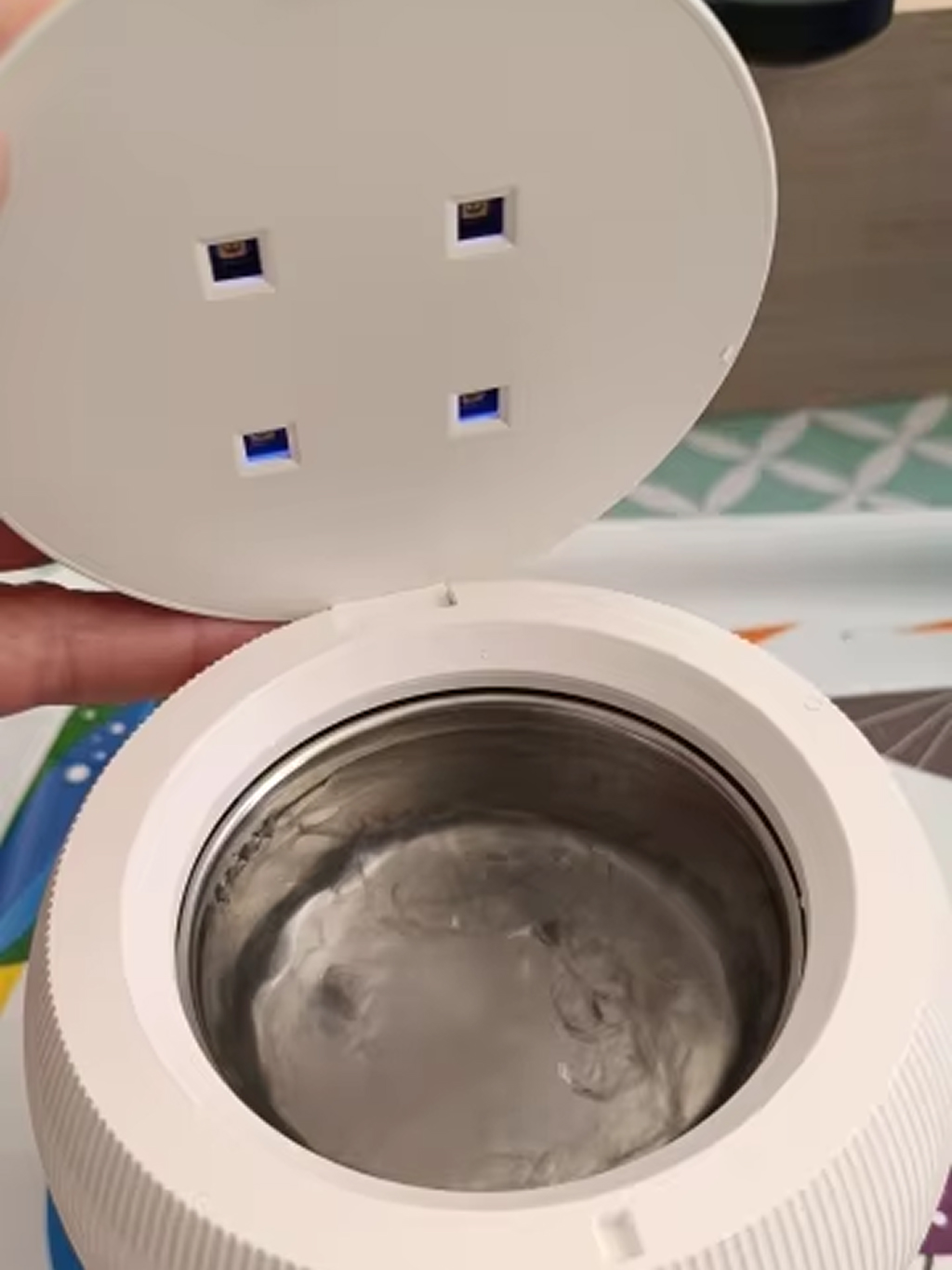 TrayNify uses 42,000 Hz ultrasonic vibrations to create micro-bubbles that penetrate crevices and dislodge debris, while UV light simultaneously kills 99.99% of bacteria, viruses, and germs for comprehensive cleaning.