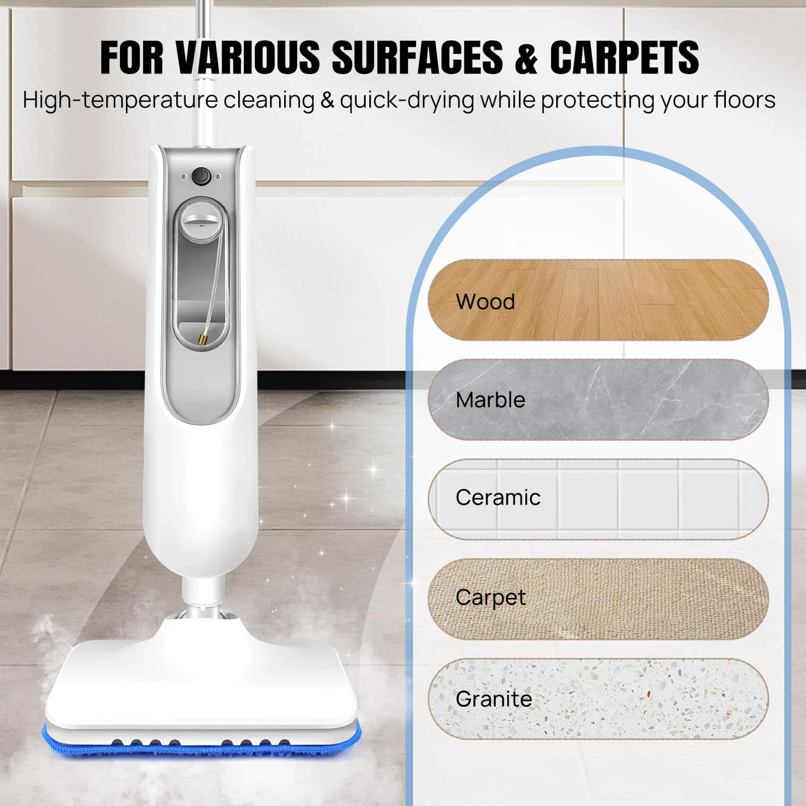 The VaporGlid Steam Mop heats up in just 20 seconds, allowing you to begin cleaning almost immediately. This rapid heat-up technology saves valuable time during your cleaning routine.